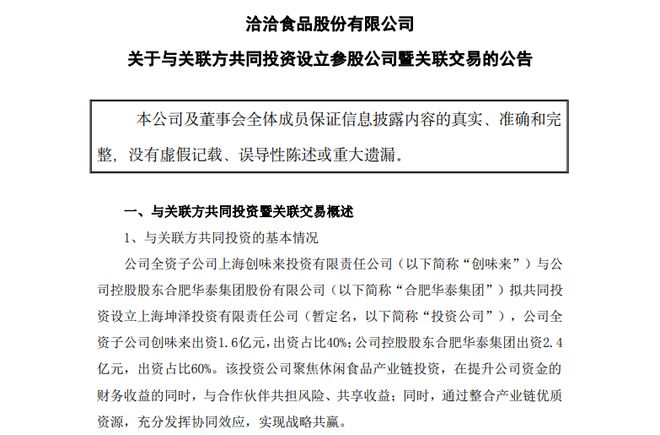 10月23日晚间,洽洽食品发布公告显示,公司全资子公司上海创味来投资有限责任公司(以下简称“创味来”)与公司控股股东合肥华泰集团股份有限公司(以下简称“合肥华泰集团”)拟共同投资设立上海坤泽投资有限责任公司(暂定名,以下简称“投资公司”),公司全资子公司创味来出资1.6亿元,出资占比40%;公司控股股东合肥华泰集团出资2.4亿元,出资占比60%。