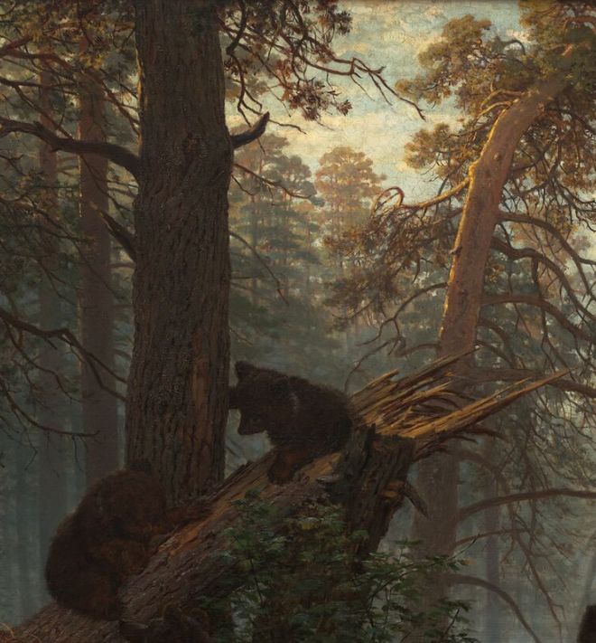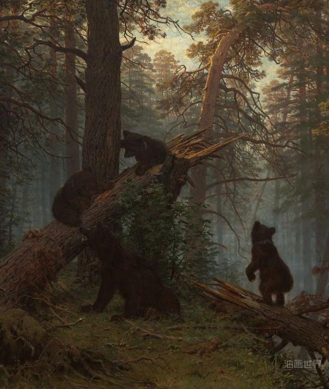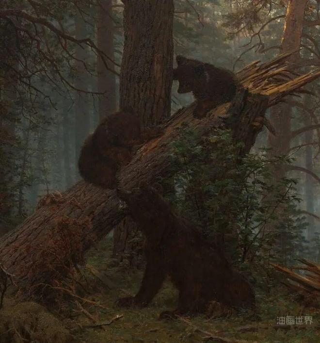 茂密的松林遵循着自己的规律。参天大树的生长与凋零仅受自然循环的支配。一场风暴曾连根拔起一棵雄伟的松树。一家族熊正悠然地栖息在其断裂的树干上。无人能打扰这些生灵天真的嬉戏。画面前景中的这群熊最引人注目。任何驻足观画者首先会被这些森林的主人吸引,仿佛它们才是画作的主体。