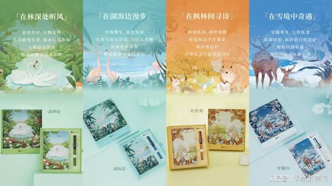森野仙踪系列套装精心设计了「在林深处听风」「在湖海边漫步」「在枫林间寻诗」「在雪境中奇遇」四大主题,分别对应森野绿、湖海蓝、叶影黄、雪境白四款笔身主色调。每款礼盒均采用树签雅制艺术纸精制,纸张表面保留树木原生肌理触感,搭配独特的纹理设计,让用户从开盒瞬间即能感受到自然的呼吸与感受。