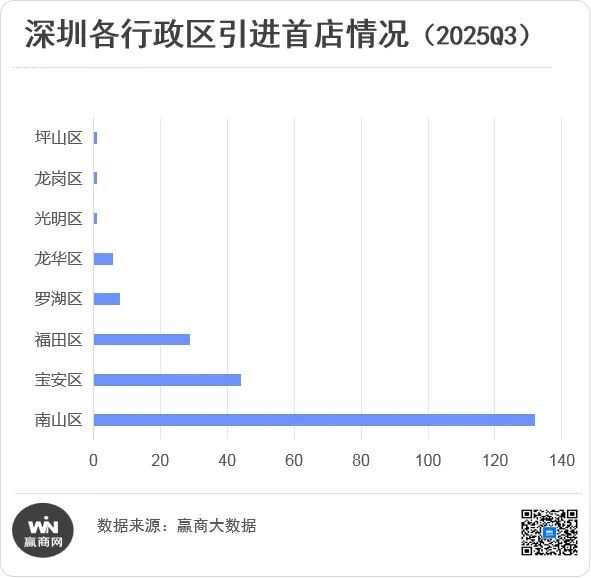Q3首店依然高度集中于核心城区,南山区(132家,占比超60%)、宝安区(44家)、福田区(29家)位列前三,三者合计占全市超90%;其他行政区(罗湖、龙华等)合计17家,占比不足10%。反映出深圳首店资源向经济、商业、人口密集区域高度聚集的特征,南山区、宝安区等核心商圈(如后海商圈、宝中商圈)的扩容升级,为不同能级首店提供了落地空间。